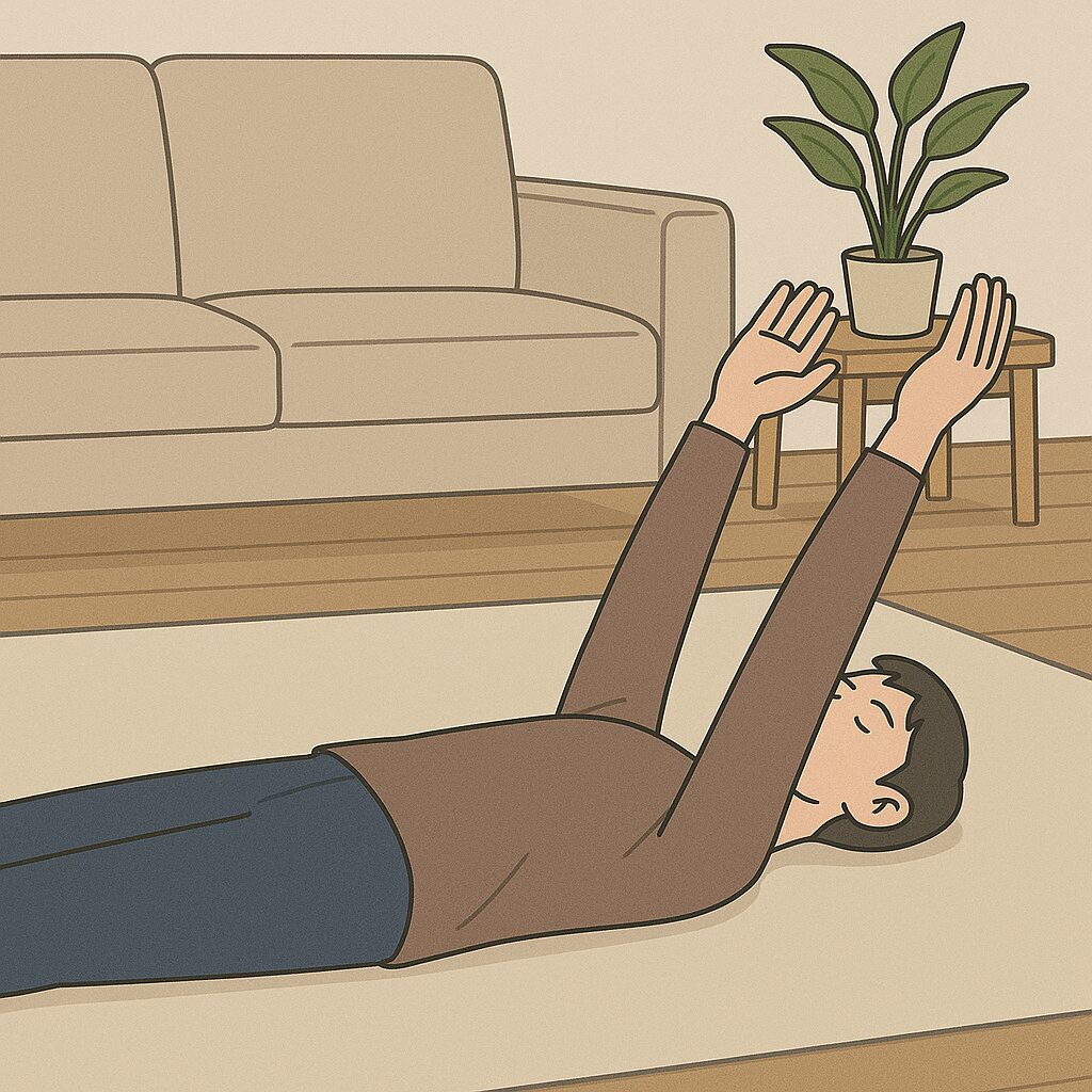 - 仰向けのまま、両腕を天井に向かって伸ばします。