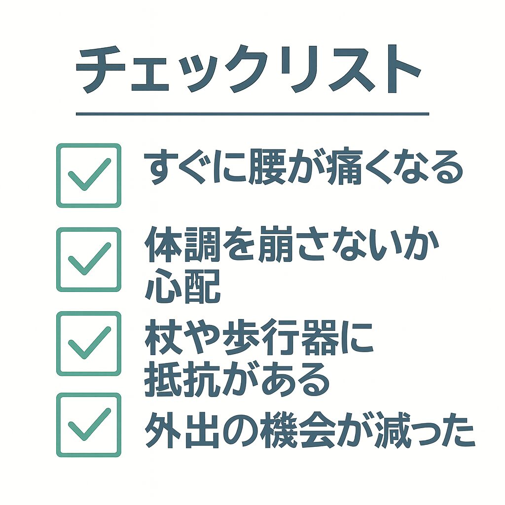 しかし、歩くと生じる腰の痛みや、長距離を歩くことへの不安から、外出そのものをためらってしまうケースも少なくありません。