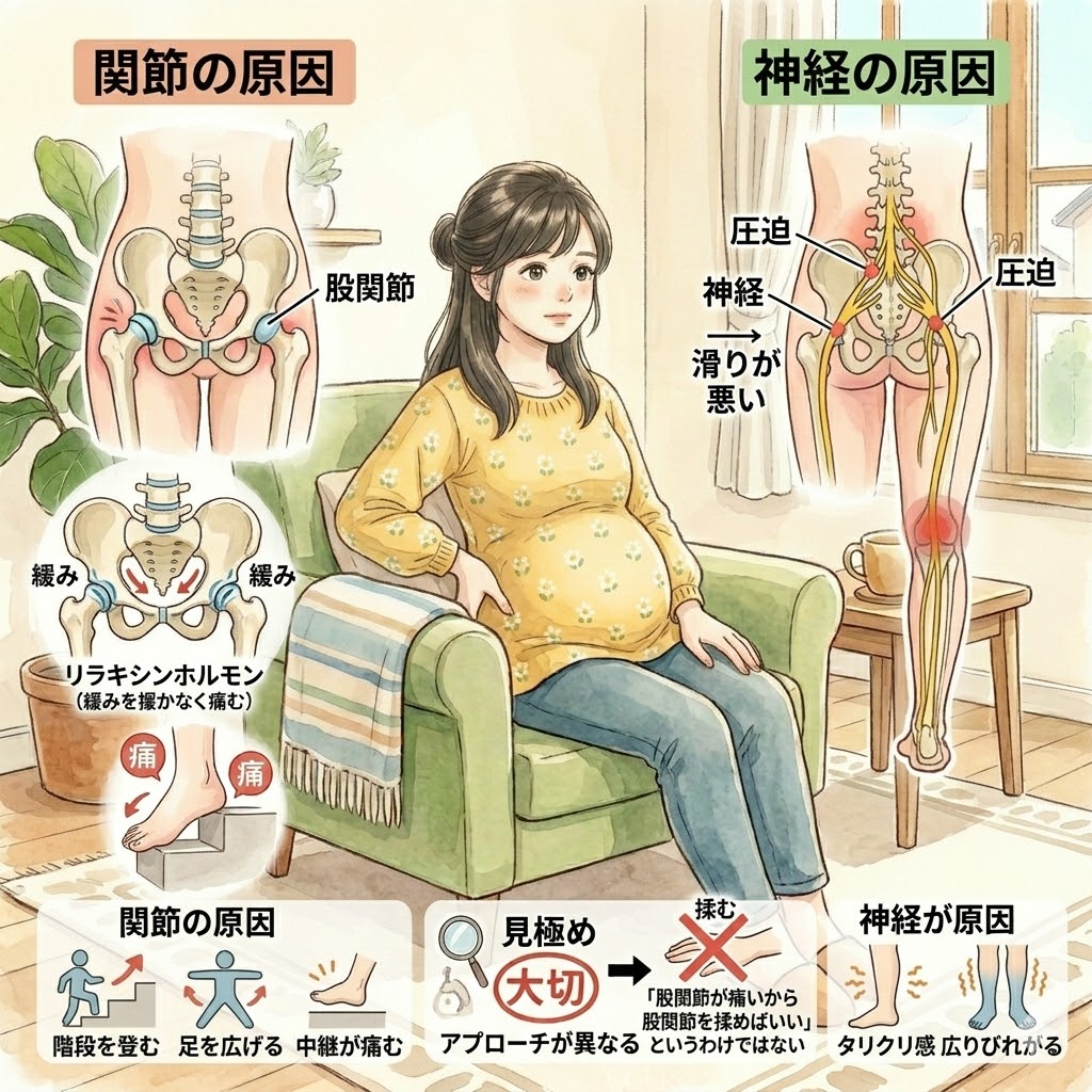 妊娠中の股関節の痛みには、大きく分けて「関節」が原因のものと「神経」が原因のものがあります。