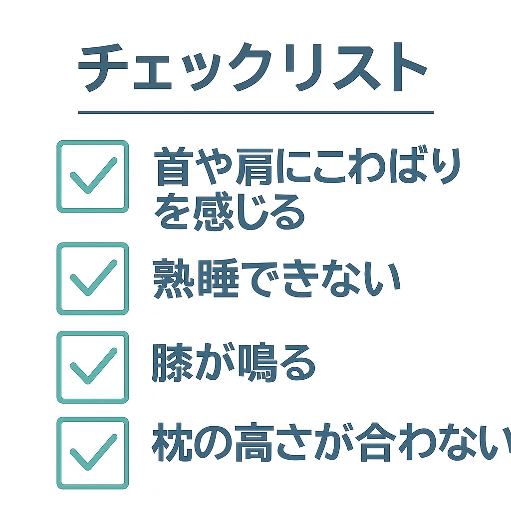 枕が合わないと感じる首の不調や、膝の違和感は、寝具や関節そのものだけでなく、日々の生活習慣が大きく影響している可能性があります。