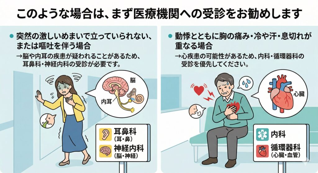 症状が強い場合や、急激に悪化している場合は、まず内科・耳鼻科・神経内科などの受診をお勧めします。